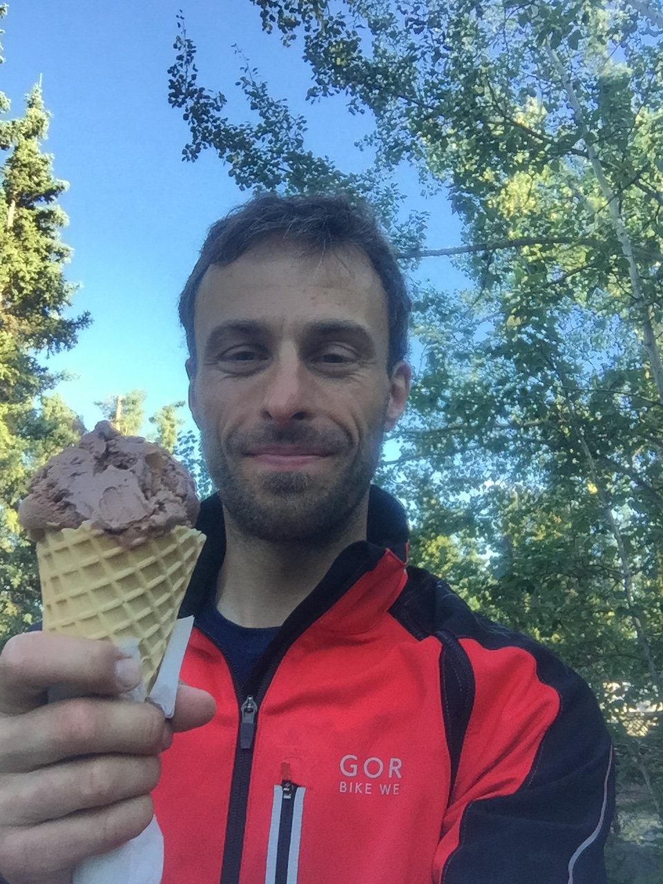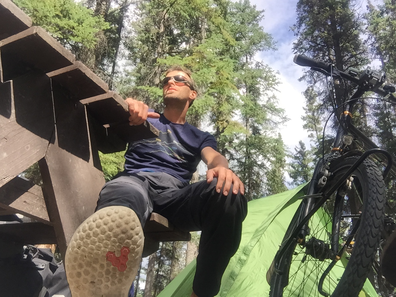 Beat’s Magen hat sich wieder beruhigt und er hat den Zeltplatz um halb neun verlassen. Ich habe mir heute das restliche Proviant gekauft und das Velo geputzt. Mein ganzes Essen hat nicht im Bärensicheren Container platz. Bis jetzt habe ich eine Ortliebtasche mit Essen gefüllt und neben den Container gelegt in einigem Abstand zum Zelt. Wie sagt man so schön, die Dummen haben immer Glück. Das Essen hängt man in einem Sack an einen Baumast, dass die Nager nichts kriegen. Die fressen sich glatt durch die Ortliebtasche und schlagen sich den Bauch voll. Mit Nager meine ich die Eichhörnchen die sie hier haben. Sie sehen herzig aus, sind es aber nicht. Hinterlistige, hungrige, freche, nervige, pelzige Nager sind es. Tja, ich habe meine Schätze jetzt auf jeden Fall in luftige Höhen gehievt, wäre ich ein Pfadfinder wäre der Knoten auch etwas besser.