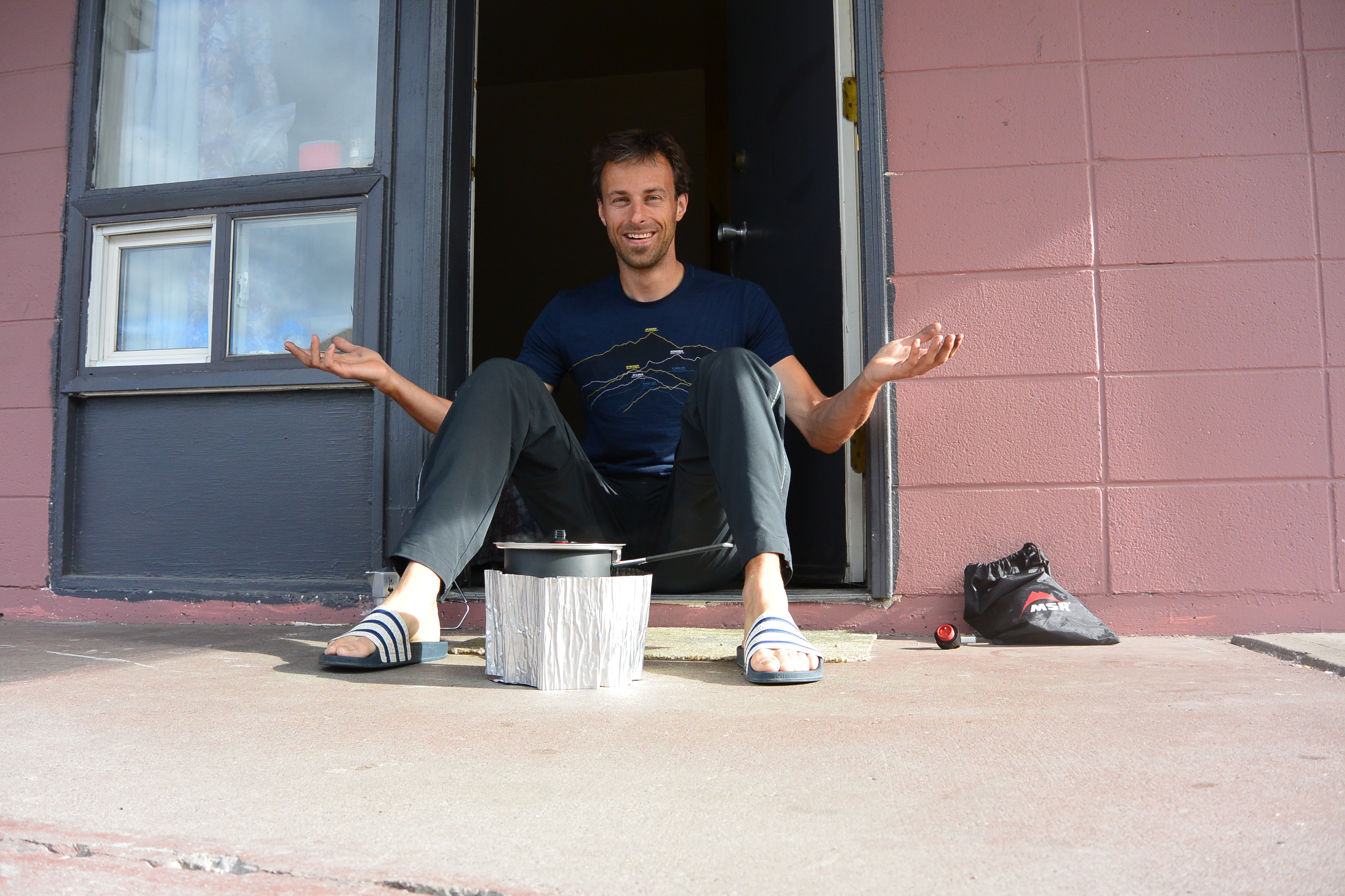 Der Schlaf im Bett hat gut getan, ich fühle mich sehr ausgeruht und fit. Auch im Motel koche ich mir Porridge und zwar mit dem Benzinkocher im Gang, dazu gibt’s Kaffee und „Honig-Schnettli“.
