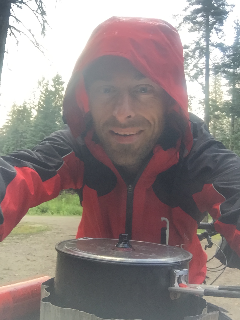 Eines kann ich gleich vorweg nehmen. Am heutigen Tag bleibt uns beiden nichts erspart. Es fängt alles so schön an, es ist trocken, die Sonne scheint den Kampf mit den Wolken für sich zu entscheiden, Omega Supreme hat keine Beschwerden nach dem ersten Velotag. Wir kommen gut voran, trotz mühsamem Höhenprofil, damit meine ich es geht ständig berauf und bergab. Nach über 100km erreichen wir die Lasalle Lakes Recreation Site. Die Sonne bläst zum Rückzug und überlässt Madam grau und dunkel das Feld. Die Zelte können wir gerade noch trocken aufbauen, danach versteht Madam keinen Spass mehr und lässt es krachen mit Regen, Hagel, Donner und Blitz.