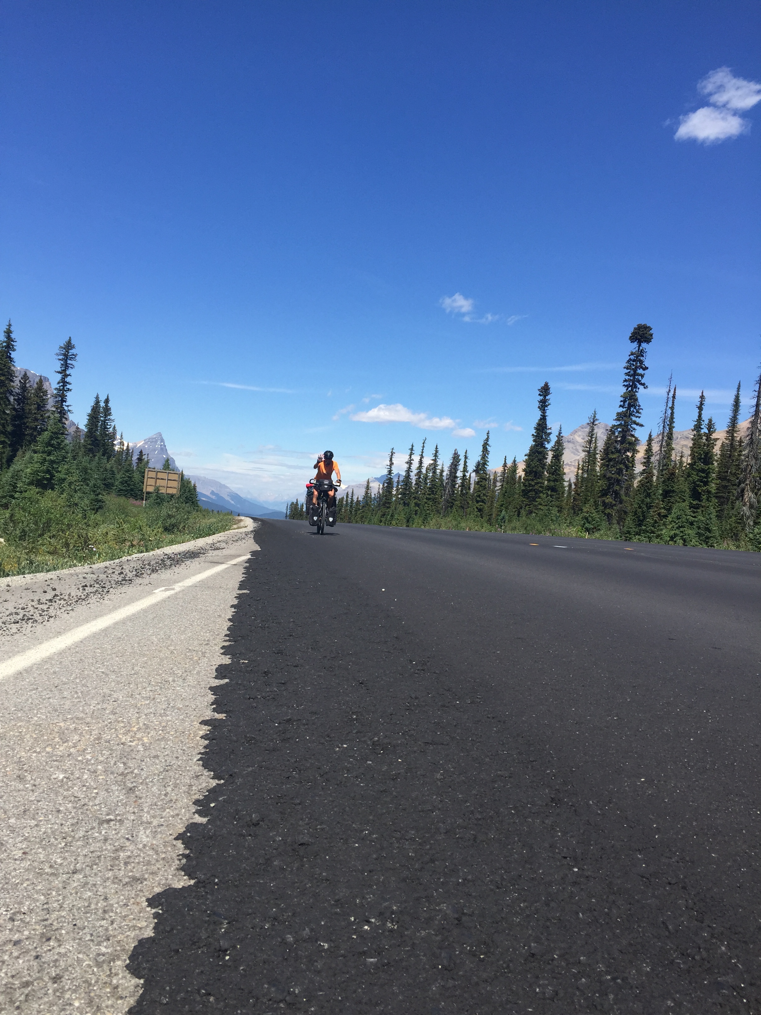 Wieder stehen wir früh auf und der Tag beginnt mit einer Hiobsbotschaft. Der Parkranger, der auch schon früh munter ist, erklärt uns, dass es in Lake Louise kein Platz haben wird. Genau dort hin wollte wir heute, denn nach 2 Tagen Katzenwäsche, ich denke ich muss nicht noch mehr ins Detail gehen. Wir fahren los, aber diese negative Nachricht lässt sich nicht abschütteln, wie ein Parasit haftet sie an uns. Das kleine Frühstück am the Crossing Resort hebt die Stimmung zwar, gut ist sie deshalb aber nicht. Gute Gedanken sind aber nötig, da es heute den Bow Pass zu überqueren gilt. Er ist ein bisschen höher als das Icefiled Center, jedoch ist der Anstieg nicht so steil wie gestern. Etwa auf halbem Weg begegnen wir einem Franzosen der ebenfalls mit dem Velo unterwegs ist. Von ihm erfahren wir, das es in Lake Louise für Velofahrer Platz hat, wenn man nur eine Nacht bleibt. Eine gute Nachricht und ein sehr netter Zug des Nationalparks. Die Verständigung mit ihm ist etwas schwierig, denn wir sprechen nicht gut Französisch und er nicht gut Englisch. Irgendwie versteht man sich dann aber schon. Wir bewundern diesen Mann, denn er ist 70 Jahre alt und durchtrainiert vom Scheitel bis zur Sohle. Mit 70 fährt er durch den Icefield Parkway, ganz alleine und hat Spass dabei.