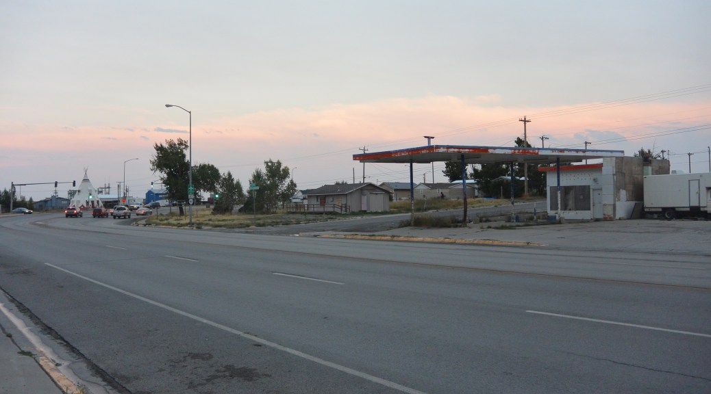 Am Abend gehe ich nochmals raus um die Stadt photographisch festzuhalten. Offensichtlich bin ich ein Magnet für Indianer, diesmal betrunkene Indianer, ich präzisiere voll bis obenhin, komplett besoffen. Eine ca 50 jährige Indianerin hat die Fähigkeit zu sprechen temporär verloren, ich verstehe das Gemurmel nicht. Ihre gleich alte Kollegin ist der Sprache noch plus minus mächtig. Sie erzählt mir allerhand von Jesus, das sie für mich bete, das sie für alle Menschen bete. Ich höre zu, bin ja ein netter Kerl. Als ihr Mann dazu kommt, offenbart sich ihr Plan. Ob ich denn etwas Geld entbehren könne. Eigentlich war diese Frage klar, ich gebe ihr 5 Dollar, finde das sehr grosszügig. Sie ist da anderer Meinung, aber diesmal bleibt der nette Kerl hart, es gibt nicht mehr Geld. Auch nicht als sie mir Tabak gibt. Tabak habe bei den Blackfeet Indianer eine Bedeutung, er beschütze seinen Träger. Tja, dann bin ich jetzt beschützt!!!
