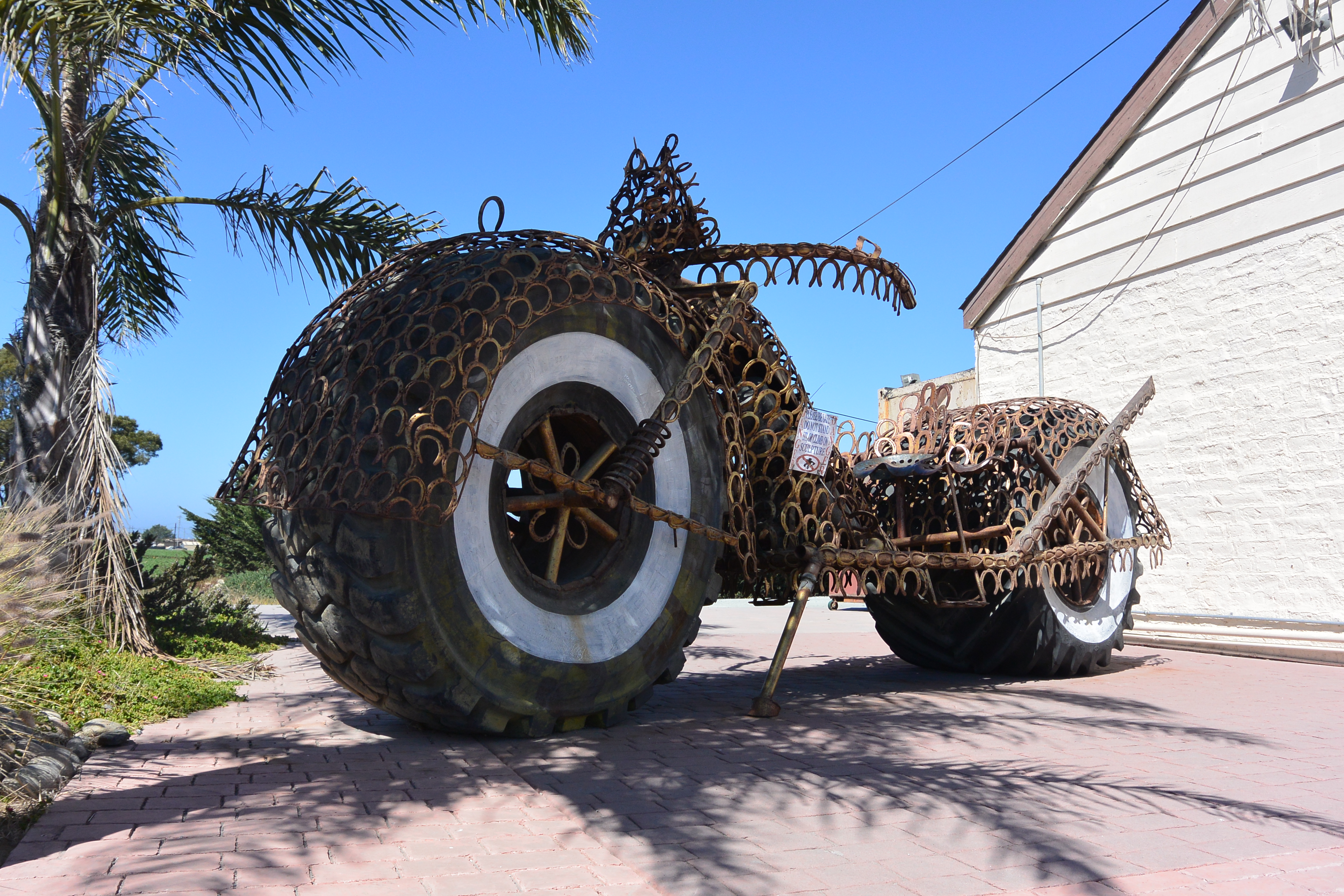 Auf jeden Fall duftet die Luft nach Erdbeeren und die Arbeiter auf dem Feld haben Freude wenn ich ihnen zuwinke. Kurz vor Moss Landing erblicke ich diese Motorrad-Skulpturen. Es sind quasi die Galionsfiguren eines Biker-Lederwaren-Geschäftes. Hier kann sich der Harley-Biker kleidermässig mit allem eindecken was das Herz begehrt. Für Velofahrer gibt es leider keine passenden Accessiors.